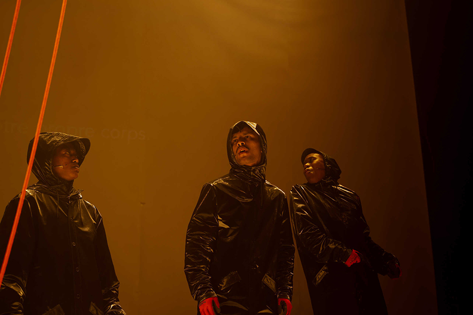 She is joined by Omagbitse Omagbemi (Dance On Ensemble), Mulunesh, and Malick Cissé – performing artists from different generations – to construct a performance between the ritual, the apocalypse, and the carnival, where narrated identities are challenged, where flesh can deviate and be corrupted until it bursts and becomes unbearable. The dancers express their standing in the world with incoherent, broken-down movement in a scenery that collapses around them. In an increasingly unstable world of hiccups and unlikely events, often gruesome and violent, we are reminded of early horror movies and this eerie feeling, the flicker in the dark.